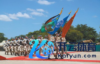 10月3日,在结合国驻南苏丹特派团中国营区内举行的授勋庆典上,中国第十批赴南苏丹(朱巴)维和步兵营官兵走过雠校区。