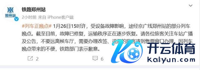 1 月 26 日 15 时许,受开垦故障影响,路过京广线郑州站的部分列车误点。约束当今,故障已建设,输送治安正在缓缓复原。请诸君游客关爱车站播送及公告万博manbext网页版登录app官网,不要远隔候车厅,需要办理改签、退票的游客请到售票窗口办理。因列车误点带来的未便,铁路部门暗示歉意。